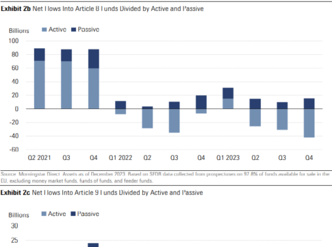 I hele 2023, art. 8 havde netto outflows på 27 mia. EUR, mens art. 9 fonde havde nettoinflow på 4,3 mia. EUR, og art. 6 fondene 93 mia. EUR i netto inflow.