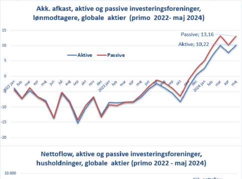 Samtidig har husholdningerne (lønmodtagere + personligt ejede virksomheder) i perioden strømmet til de passive investeringsforeninger med globale aktier, som i samme periode har haft et positivt nettoflow på 7,6 mia. kr., mens de de aktive fra husholdningerne har haft et negativt nettoflow (udtræk) på 18,2 mia. kr. Nettoflow er nettokøb fratrukket udbytter, hvoraf mange geninvesteres.