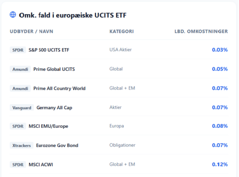 Den stigende investorinteresse for ETF´er og indeksfonde i Danmark og Europa har fået mange udbydere til at sænke omkostningerne for stå bedre konkurrencemæssigt.