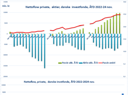 Særligt i oktober og november har de private invesotrer været tiltrukket af aktiefonde, med nettoflow i oktober og november på henholdsvis 2,1 og 1,8 mia. kr. De to måneder trækker næsten hele årets nettoflow til aktiefonde. Passive aktiefonde har til og med november haft et positivt nettoflow fra private på 9,8 mia. kr., mens de aktive aktiefonde i samme periode har haft et negativt nettoflow på 5,3 mia. kr.