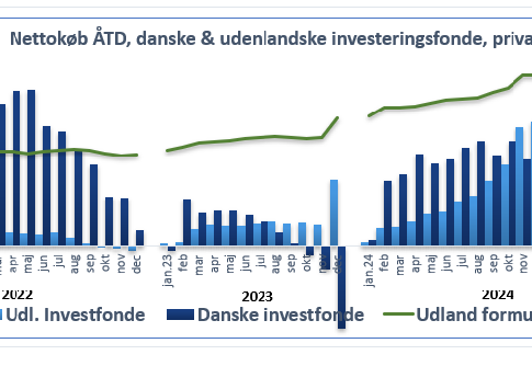 I 2024 har private investorer købt udenlandske aktier for 7,6 mia. kr. og i årets to første måneder i 2025 solgt for 1 mio. kr., mens der i udenlandske investeringsfonde er købt for henholdsvis 13,6 og 2,3 mia. kr. i samme perioder. Kilde
