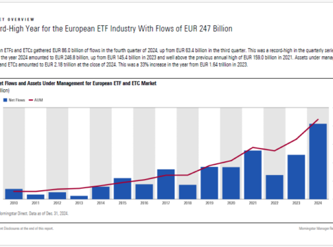 - Nettoflow til europæiske ETF´er og ETC´er beløb sig 247 mia. EUR i 2024, ifølge Morningstar´s europæiske ETF og EFC asset flows rapport for Q4. Det er en stigning fra 145 mia. EUR i 2023 og et stykke over den hidtidige rekord på 159 mia. EUR i 2021. December var ifølge ETFbook Highlights med et nettoflow til europæiske ETP´er på 31,5 mia. EUR første måned nettoflow over 30 mia. EUR