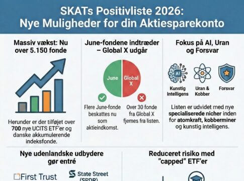 Positivlisten for 2026 er endnu engang blevet udvidet, senest pr. 29. januar 2026. Der er tilføjet lidt over 100 UCITS ETF´er og indeksfonde ved opdateringen i december, mens over 30 fonde er lukket eller fjernet, dvs. de skifter til kapitalindkomst og kan ikke længere være på Aktiesparekontoen. Der nu i alt over 700 UCITS ETF´er og danske akkumulerende indeksfonde på SKAT´s positivliste og listen med alle fonde kan ses her i Excel på SKAT´s hjemmeside. Indeksinvest fondslisten med UCITS ETF´er og danske indeksfonde med deres skattestatus kan ses her. Listen indeholder også traditionelle investeringsfonde og har nu efter opdateringen 26. januar i alt over 5.200 ETF´er, investeringsfonde og -klasser, og det betyder endnu flere muligheder på Aktiesparekontoen næste år eller for investerer, der gerne vil investere med aktieindkomst.
