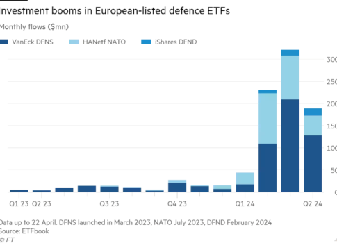 Nettoflow til tre UCITS ETF´er med forsvarsaktier alene i denne måned indtil 24. april er på 189 mio. USD, skriver Financial Times på baggrund af data fra ETFbook. I marts i år tiltrak fondene 321 mio USD. iShares fra BlackRock er også i februar kommet på banen med en helt ny UCITS ETF med investeringer i forsvarsindustrien.